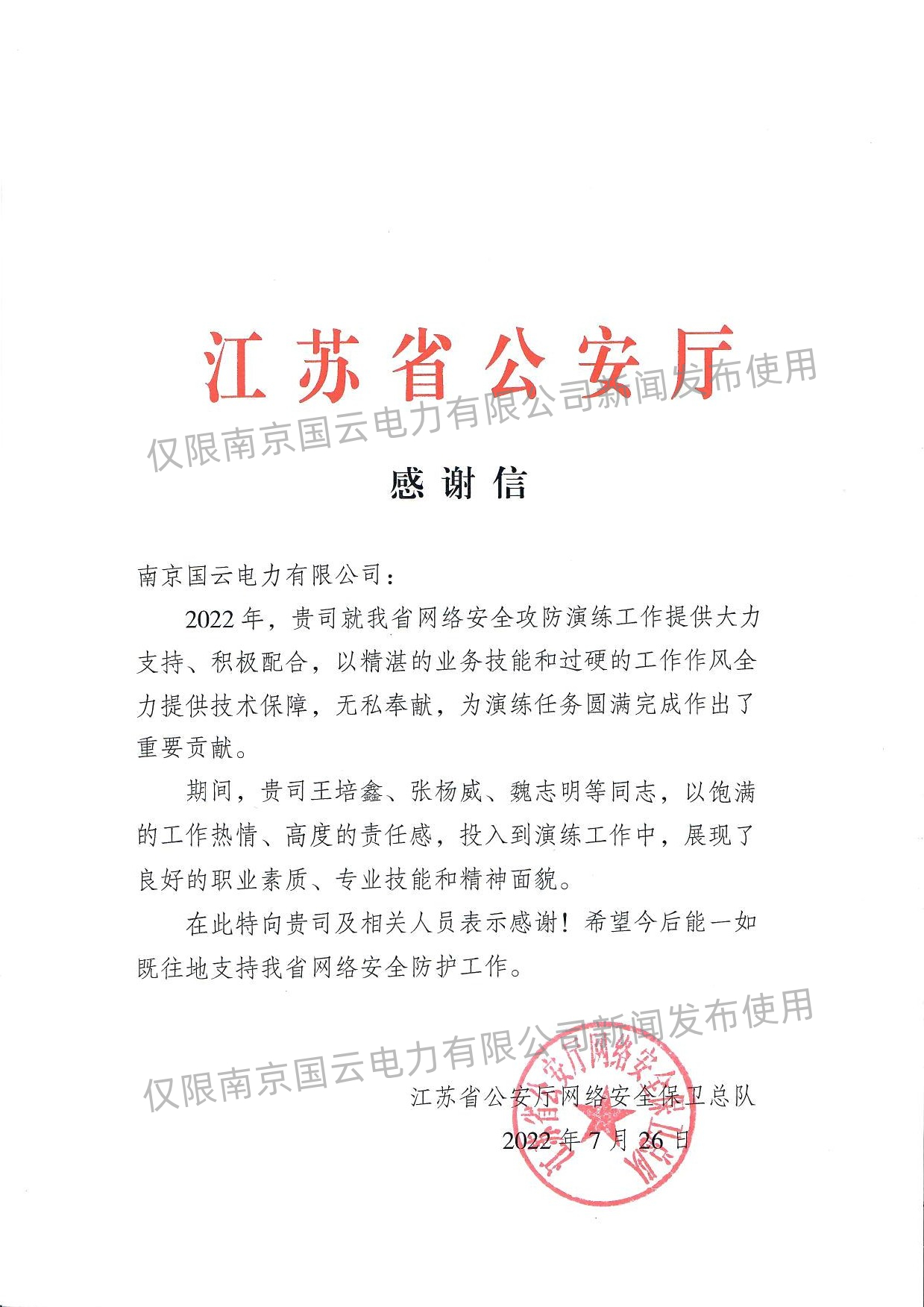 南京国云电力有限公司技术团队积极响应,6月29日至7月15日,历时近半月,最终荣获江苏省“护网2022”网络攻防实战演习二等奖,并收到省公安厅网络安全保卫总队的感谢信,圆满完成网络安全攻防演练工作,为全省网络安全网络安全防护能力的推动提升尽心尽力。