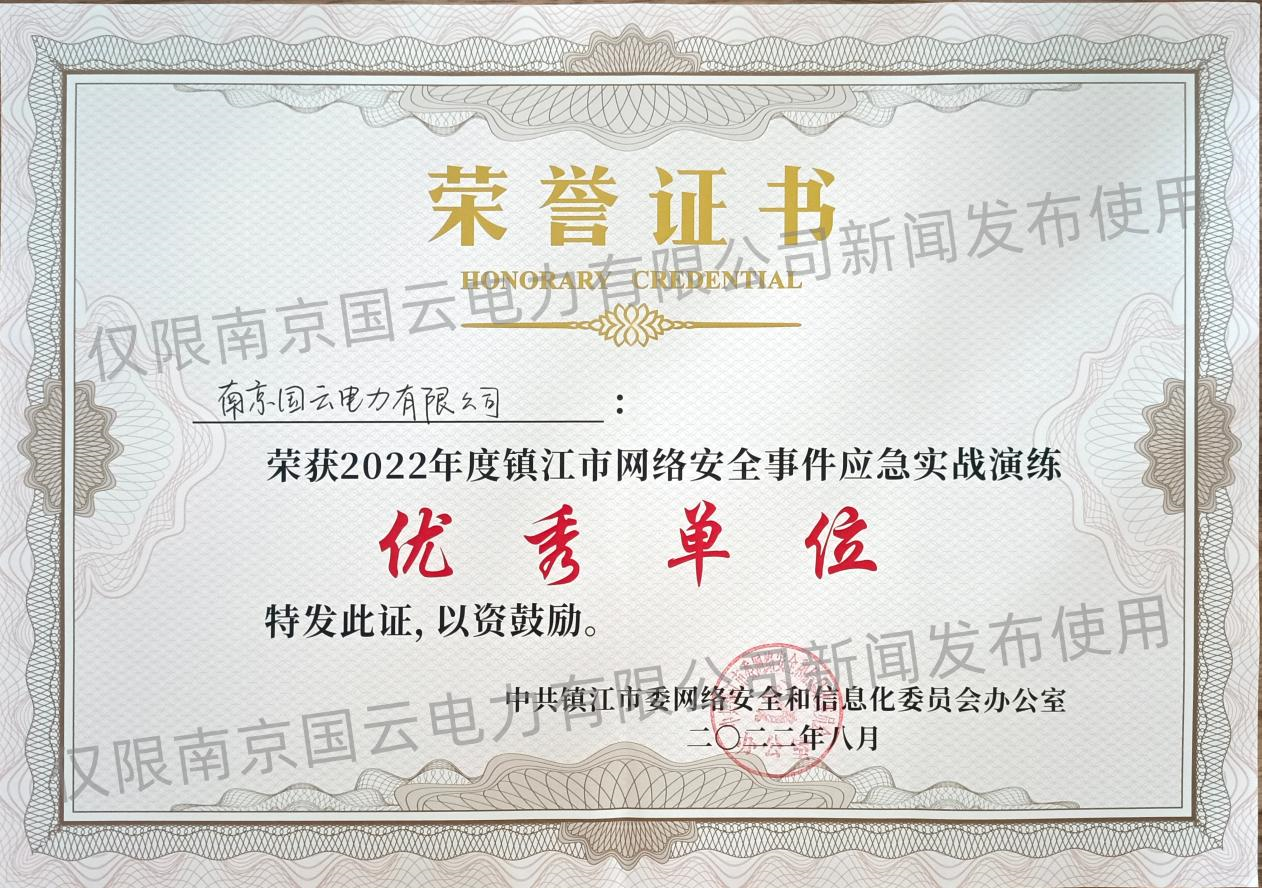 南京国云电力有限公司在此次演练中被评为2022年度镇江市网络安全事件应急实战演练优秀单位,我们将进一步提升网络安全应急处置能力,提供专业牢靠的网络安全技术服务,以实际行动迎接党的二十大胜利召开。
