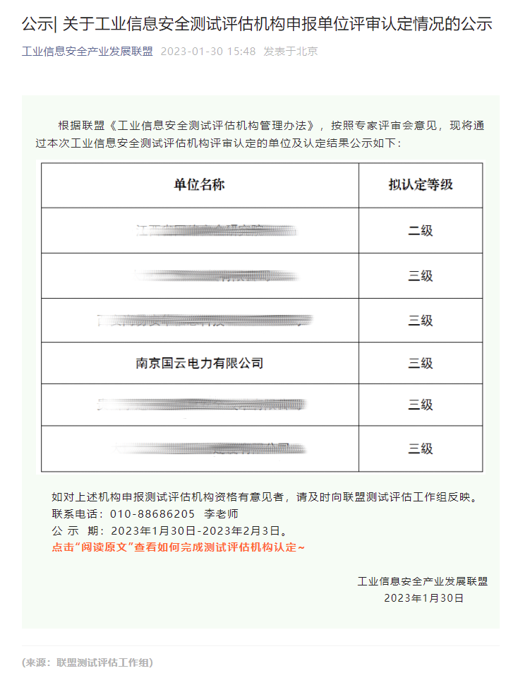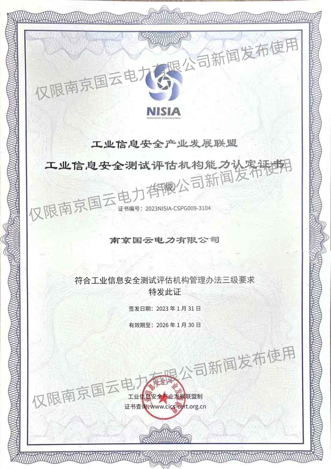 近日,工业信息安全产业发展联盟发布《关于工业信息安全测试评估机构申报评审认定情况的公示》。南京国云电力有限公司(以下简称“国云电力”)凭借自身在工控安全领域的技术及服务能力,获得“工业信息安全测试评估机构能力认定证书(三级)”。